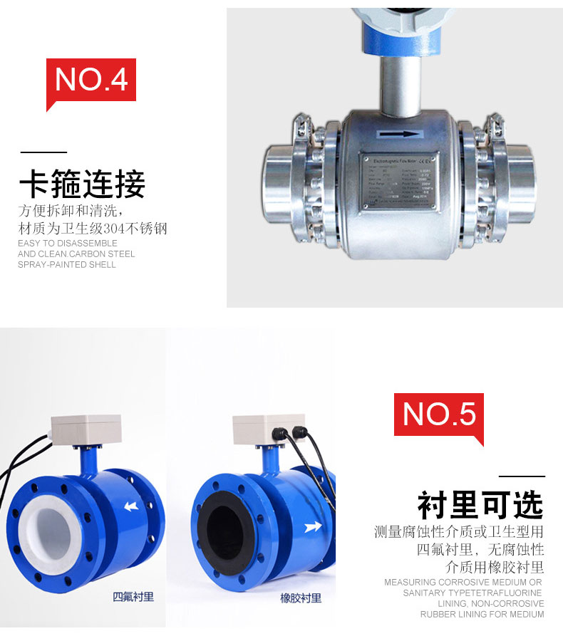 1、采用新型的衛(wèi)生型襯里材料,防止了測(cè)量介質(zhì)殘余物在測(cè)量管中的堆積。