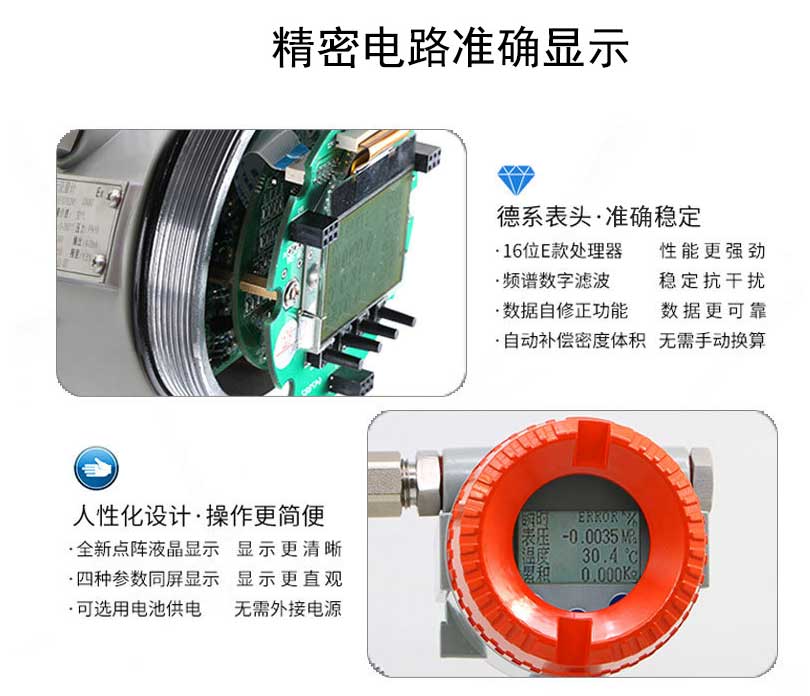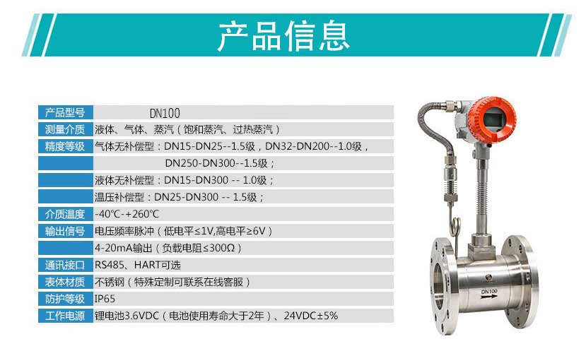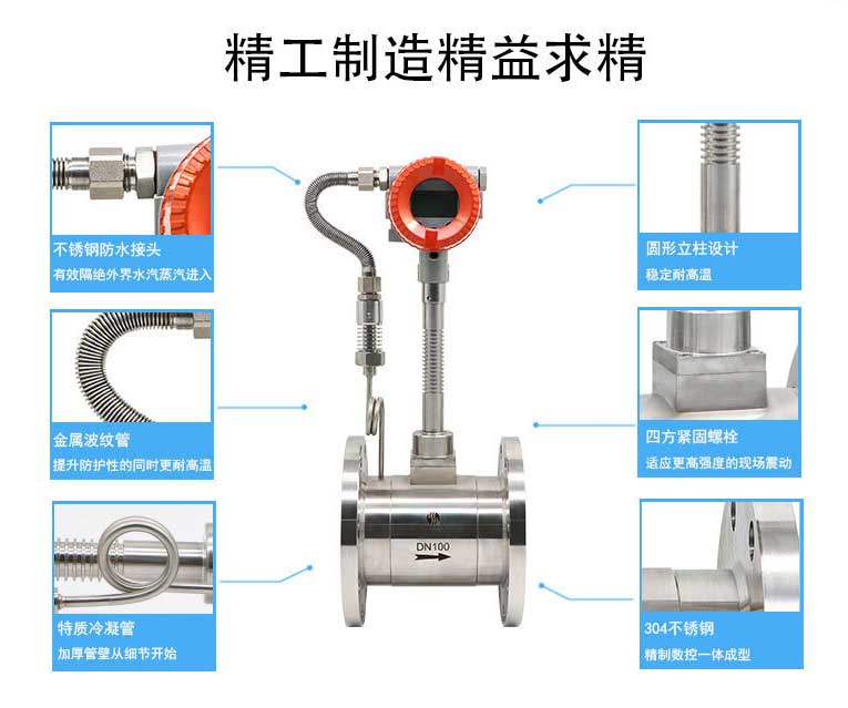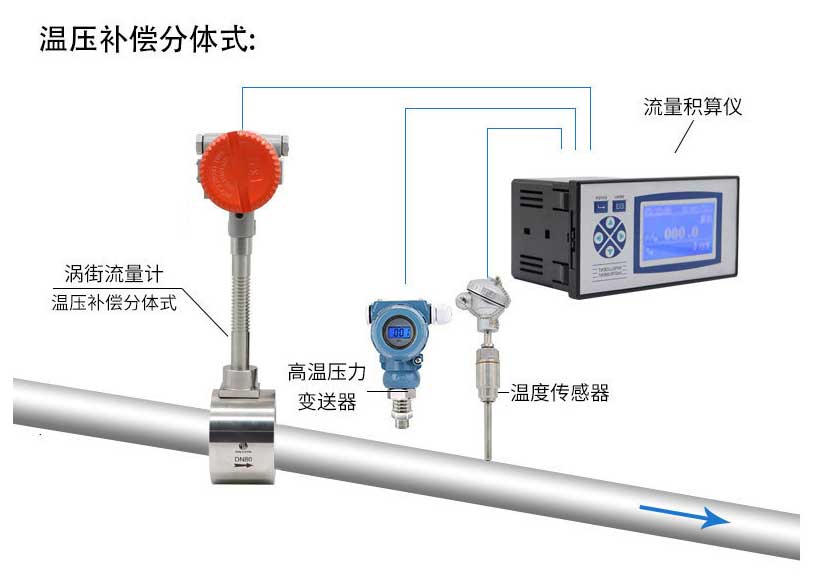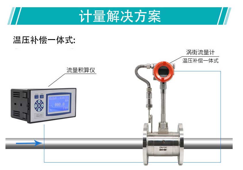 2、溫度補償一體型還帶有溫度傳感器,可以直接測量出飽和蒸汽的溫度并計算出壓力,從而顯示飽和蒸汽的質(zhì)量流量。