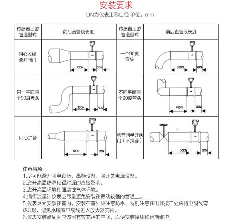 5、直管段要求:至少保證流量計前15倍管徑,流量計后5倍管徑。如流量計前有彎頭,縮進(jìn),擴(kuò)大等干擾源,則需保證流量計前30-40倍的管徑,流量計后6倍管徑。流量計應(yīng)安裝于調(diào)節(jié)閥,壓力或溫度傳感器的上游。