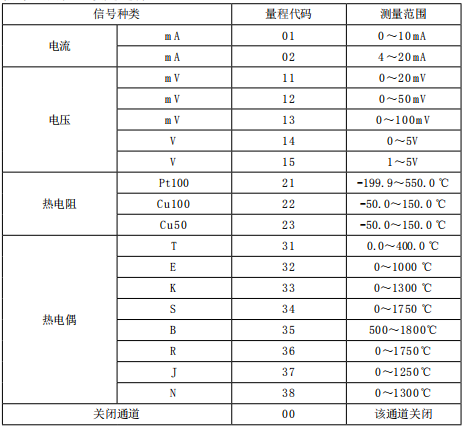 8、輸入信號種類及測量范圍:各種熱電偶、熱電阻、標(biāo)準(zhǔn)電壓及電流信號,由鍵盤設(shè)定選擇。