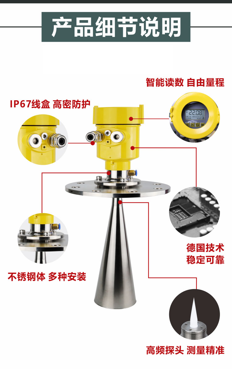 智能雷達物位計采用微波脈沖的測量方法,并可在工業(yè)頻率波段范圍內(nèi)正常,波束能量低,可安裝于各種金屬、非金屬容器或管道內(nèi),對液體、漿料及顆粒料的物位進行非接觸式連續(xù)測量。適用于粉塵、溫度、壓力變化大,有惰性氣體及蒸汽存在的場合。對人體及環(huán)境均無傷害,讓顧客買智能雷達買的放心,買的值得。高頻微波脈沖通過天線系統(tǒng)發(fā)射并接收,雷達波以光速運行,運行時間可以通過電子部件被轉(zhuǎn)換成物位信號。一種特殊的時間延伸方法可以確保極短時間內(nèi)穩(wěn)定和精確的測量。即使工況比較復(fù)雜的情況下,存在虛假回波,用的微處理技術(shù)和調(diào)試軟件也可以準確的識別出物位的回波。