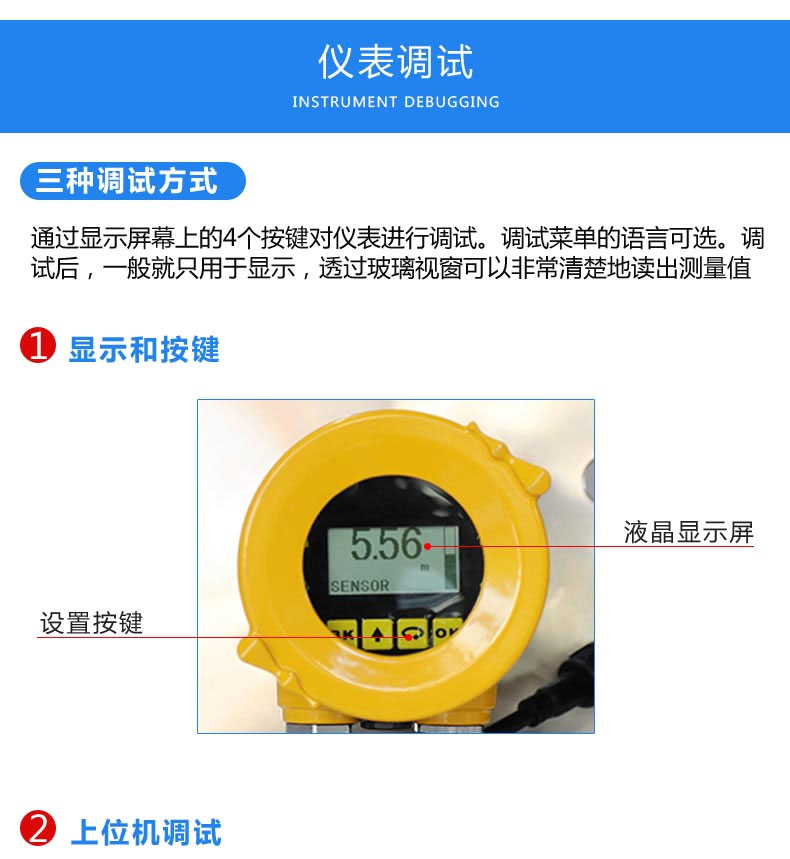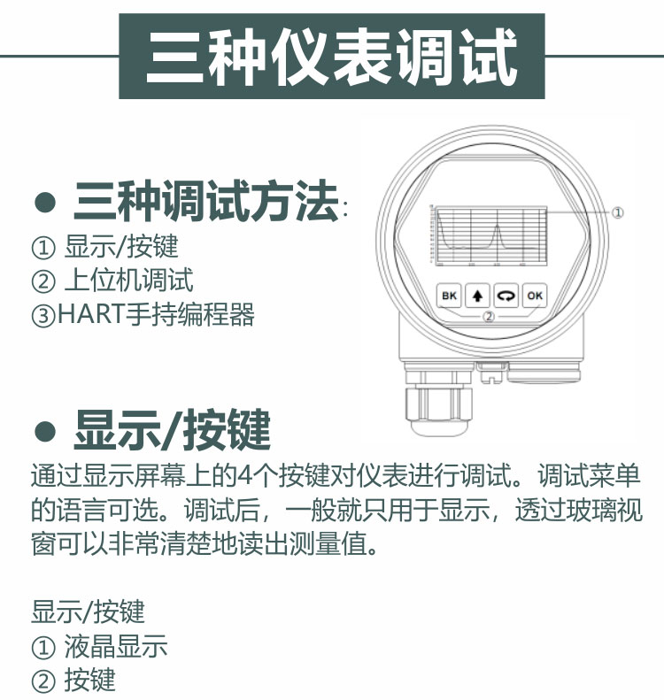 5、輸出信號為4mA~20mA/HART協(xié)議,標定簡便、通過數(shù)字液晶顯示輕松實現(xiàn)現(xiàn)場標定操作,通過軟件實現(xiàn)簡單的組態(tài)設(shè)定和編程;