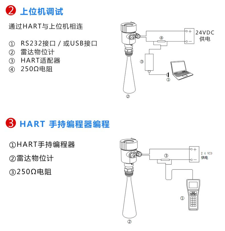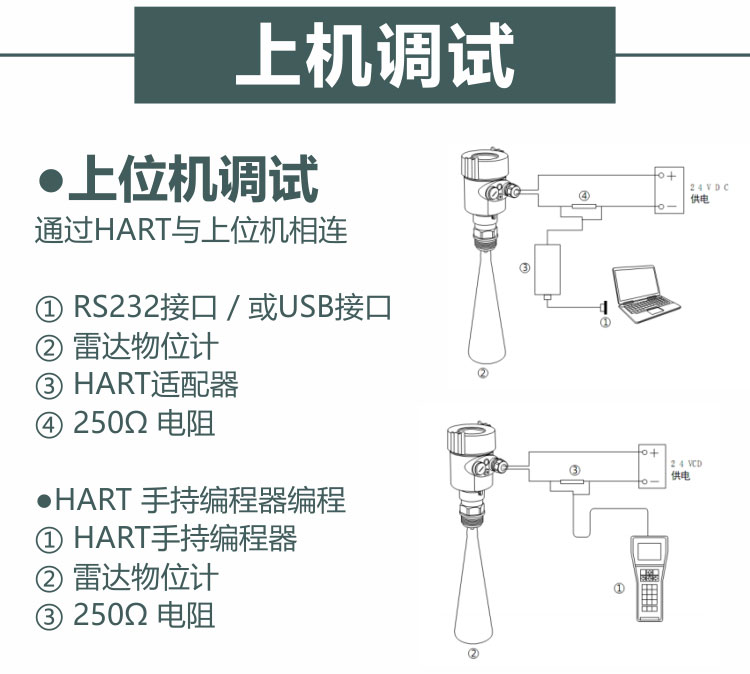 使用軟件調(diào)試的時候,給雷達儀表加電24VDC,同時在連接HART適配器前端加一個250歐姆的電阻。如果一體式HART電阻(內(nèi)部電阻250歐姆)的供電儀表,就不需要附加外部電阻,HART適配器可以和4&hellip;20mA線并聯(lián)。