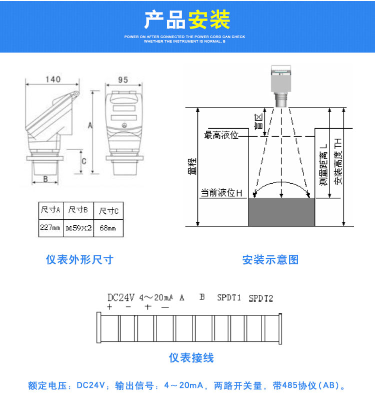 1、探頭發(fā)射面到低液位的距離,應(yīng)小于選購(gòu)儀表的量程。