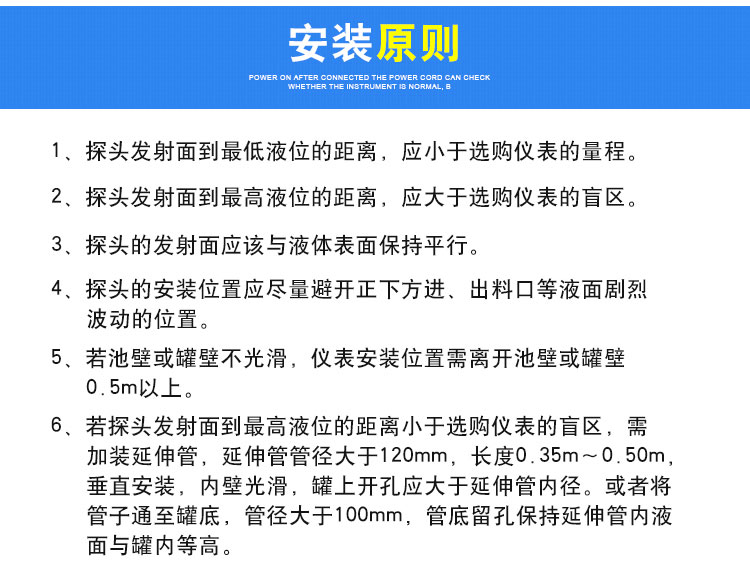2、探頭發(fā)射面到高液位的距離,應(yīng)大于選購(gòu)儀表的盲區(qū)。