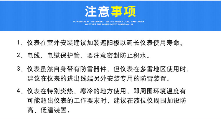 1、儀表在室外安裝建議加裝遮陽(yáng)板以延長(zhǎng)儀表使用壽命。