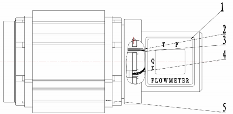 氣體腰輪流量計(jì)有5個(gè)部分組成,分別為:1、本安型體積修正儀;2、流量傳感器;3、壓力傳感器;4、溫度傳感器;5、氣體羅茨流量計(jì)(機(jī)械)