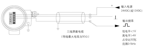 脈沖輸出型渦街流量計與其他設備之間采用三線制傳輸,所需電源為24V±10%。輸出回路的*小負載電阻為10K,*大電容為0.22uF,屏蔽線的電阻必須小于50Ω。