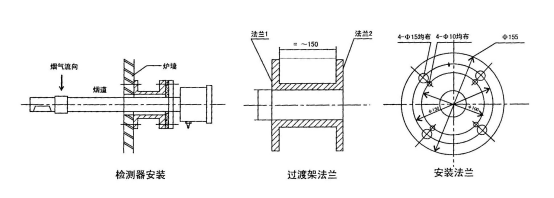 4、爐墻上的氧化鋯探頭固定法蘭安裝時,用鋼材做成如圖形狀的過渡架,過渡架的法蘭能直接焊在爐墻處壁上或埋入爐墻中,但要求氣密牢固。過渡架另一端法蘭是為固定氧化鋯探頭而設(shè),因此必須與氧化鋯探頭固定法蘭的螺孔相匹配。如選用由12mm安裝孔,則將過渡架法蘭的¢125mm圓上均布四個¢12mm的安裝孔,使用4個M1O×40的螺絲,將它與檢測器的固定法蘭緊固,為防止漏氣,兩法蘭間可填充橡膠紙板密封圈。