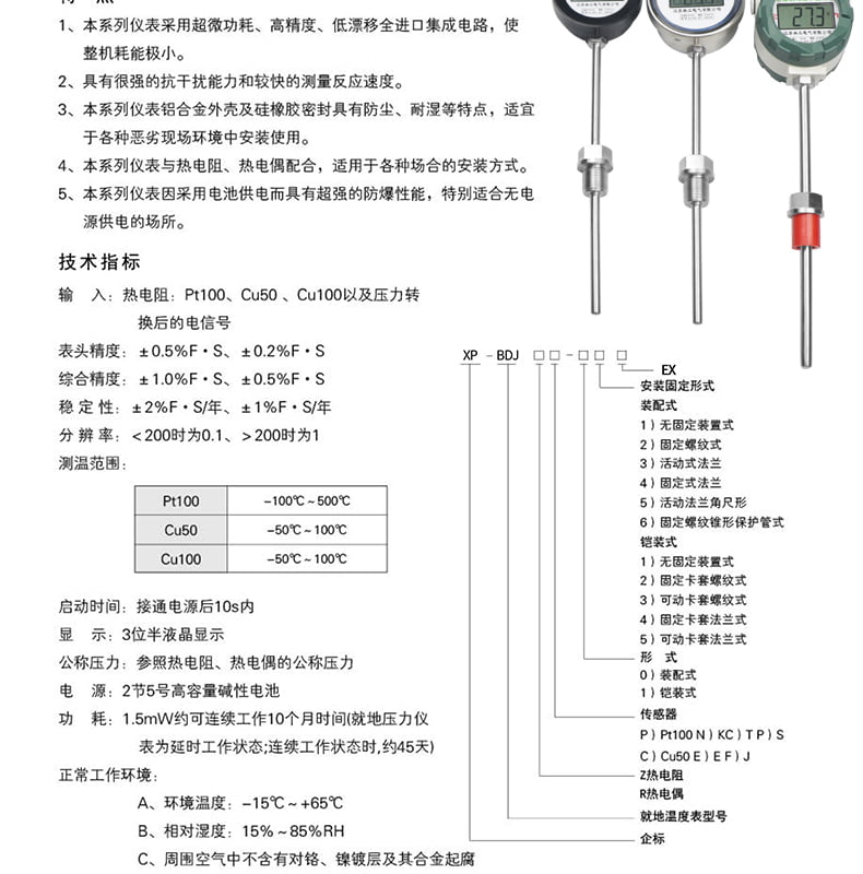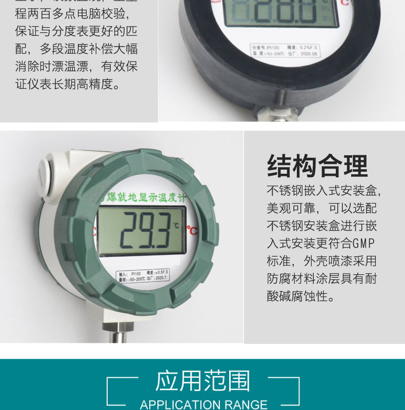 就地溫度顯示儀采用不銹鋼外殼及硅橡膠 密封,具有防塵、耐濕、抗振等特點(diǎn),適用于各種惡劣環(huán)境中安裝使用。本儀表還具有極強(qiáng)的防爆性能,是 冶金、化工、電力、紡織等行業(yè)優(yōu)選的測(cè)量?jī)x表。