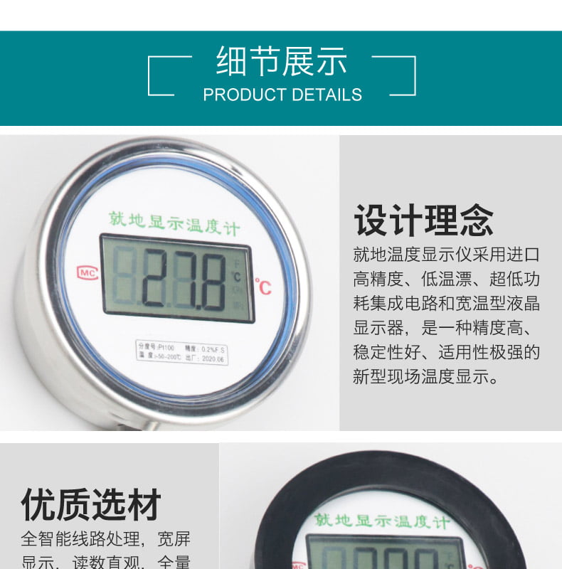 就地溫度顯示儀根據(jù)**標(biāo)準(zhǔn)采用進(jìn)口芯片生產(chǎn)而成,具有高精度、高穩(wěn)定性、誤差小、功耗小等特點(diǎn),采用不銹鋼外殼制作,使防護(hù)更加堅(jiān)固,也更加美觀。液晶顯示屏幕采用低功率集成電路制作而成,顯示更加清晰,讀數(shù)更加方便,內(nèi)置高容量的電池,可連續(xù)工作5年以上,電池供電方式解決了以前的產(chǎn)品要埋設(shè)供電電纜的難題,成為工業(yè)生產(chǎn)現(xiàn)場(chǎng)適用性極高的溫度顯示儀表。