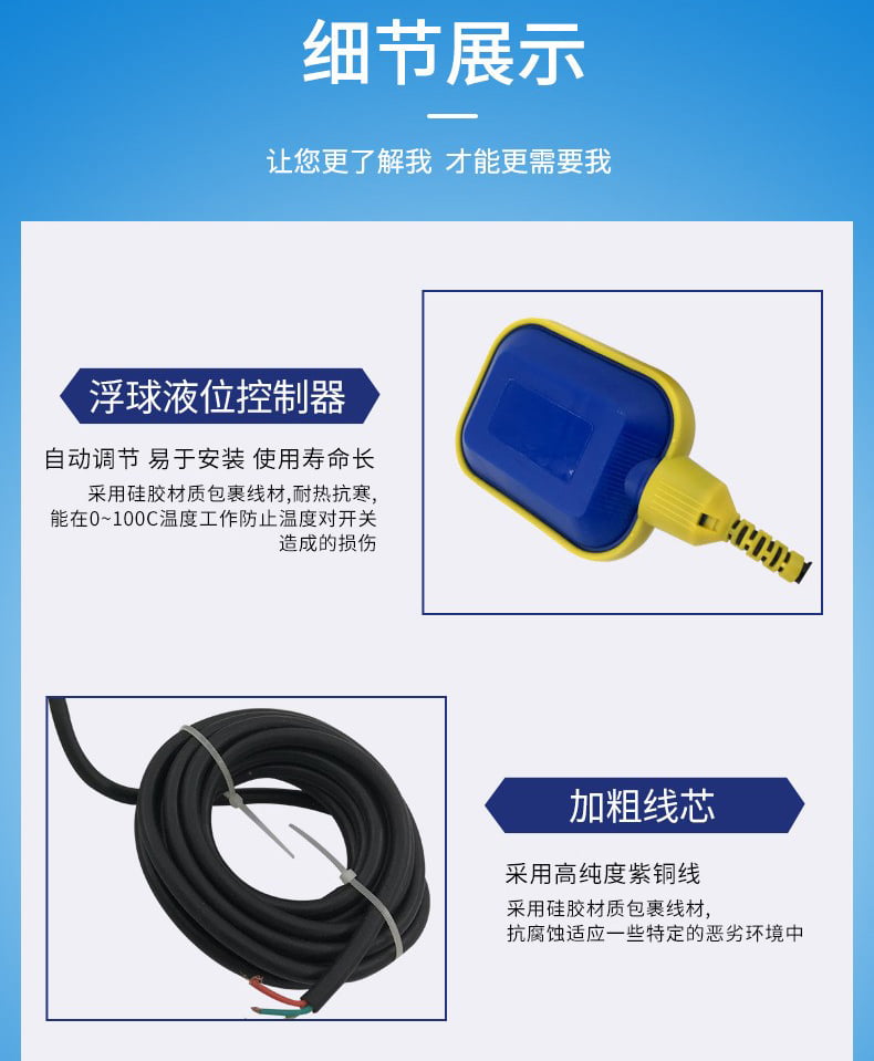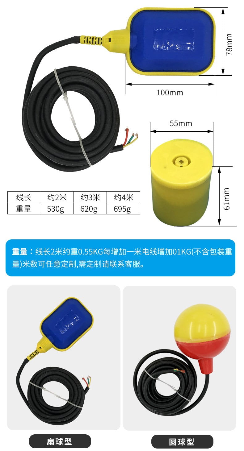 電纜浮球液位控制器是利用塑膠射出一體成型,所以結(jié)構(gòu)堅(jiān)固,性能穩(wěn)定可靠,同時(shí)無(wú)毒、耐腐蝕,安裝方便,價(jià)格低廉,對(duì)長(zhǎng)距離多點(diǎn)控制、沉水泵、有波動(dòng)的液體或有雜質(zhì)的液體控制效果佳。一般液體亦可使用。電纜線長(zhǎng)度任何長(zhǎng)度皆可定制。電纜浮球開(kāi)關(guān)為金屬,接點(diǎn)零件為水銀開(kāi)關(guān),其特點(diǎn)為耐高溫,電纜線采用高柔性電纜,經(jīng)久耐用。由于其簡(jiǎn)單可靠,經(jīng)濟(jì)方便的特點(diǎn),使其**運(yùn)用于各種大型容器的液位控制,尤其在市政給排水、消防、水處理等行業(yè)。
