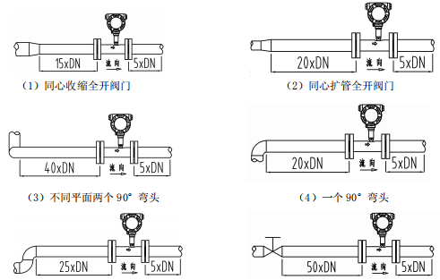 假如流量計(jì)的上游有彎頭、縮徑、擴(kuò)徑、閥門等情形,則需求更長(zhǎng)的直管段。